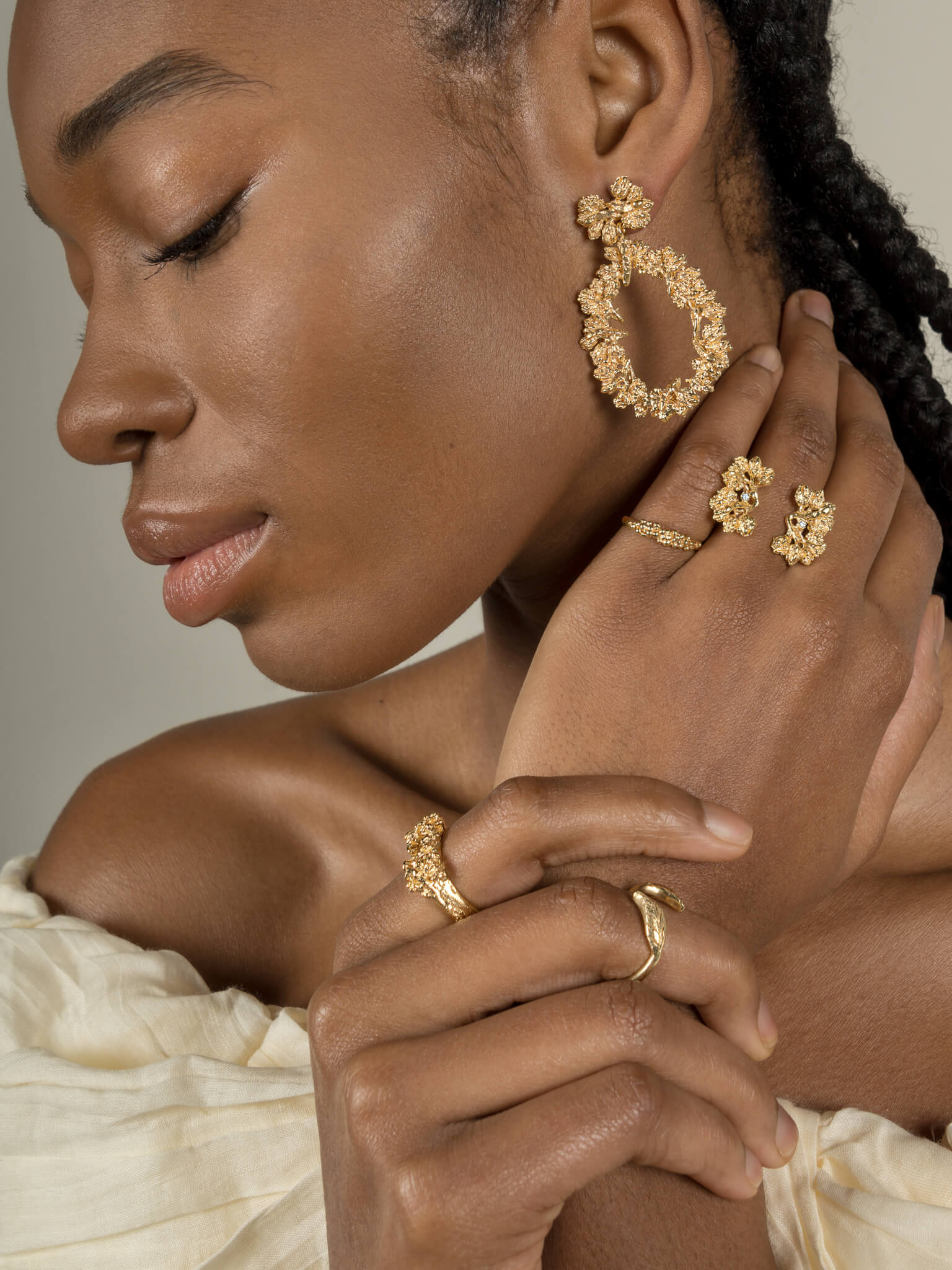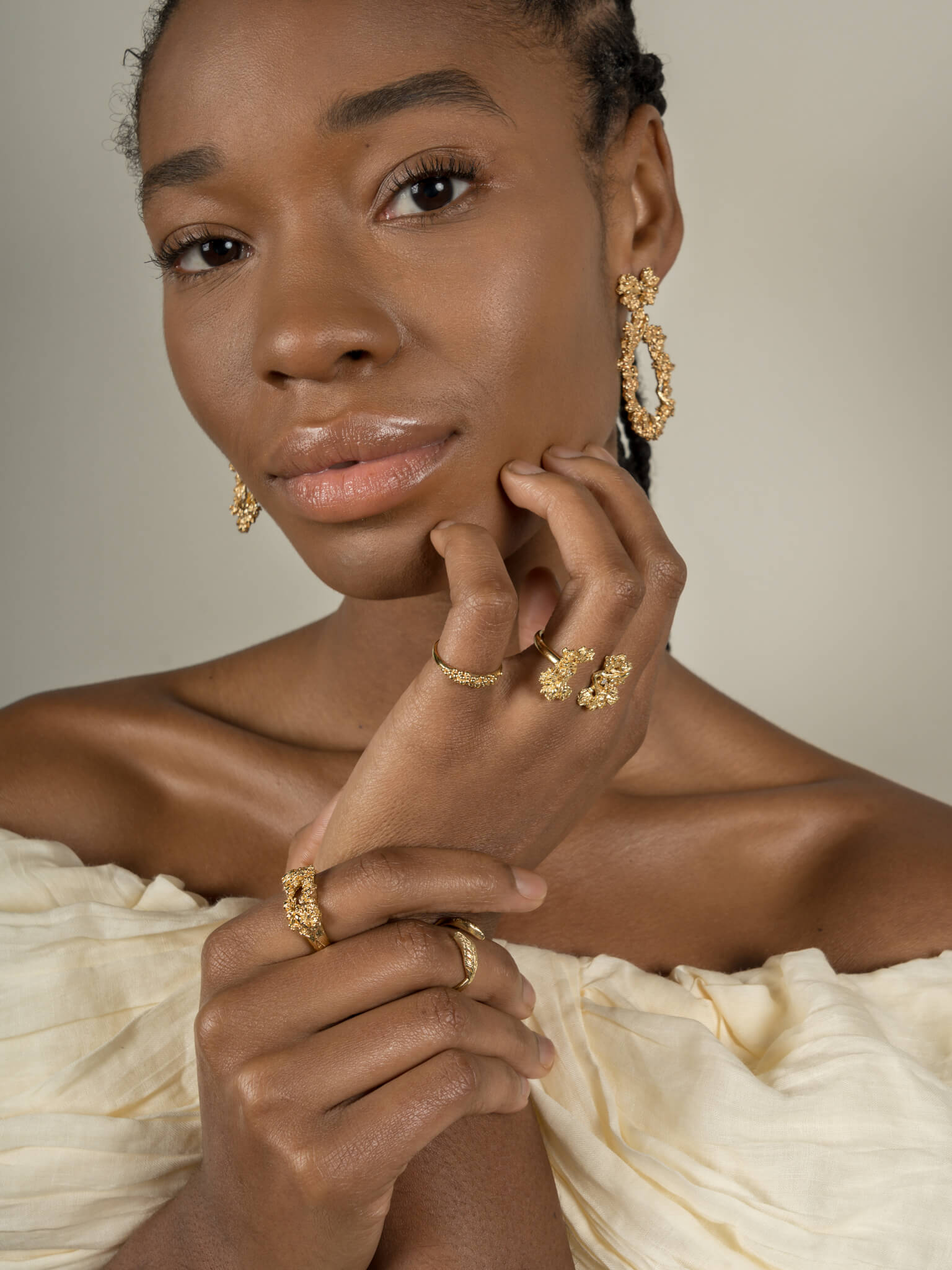 A woman exudes timeless elegance with her exquisite look, adorned with a Cremilde Bispo Jewellery Essential Dot Ring GP and earring.