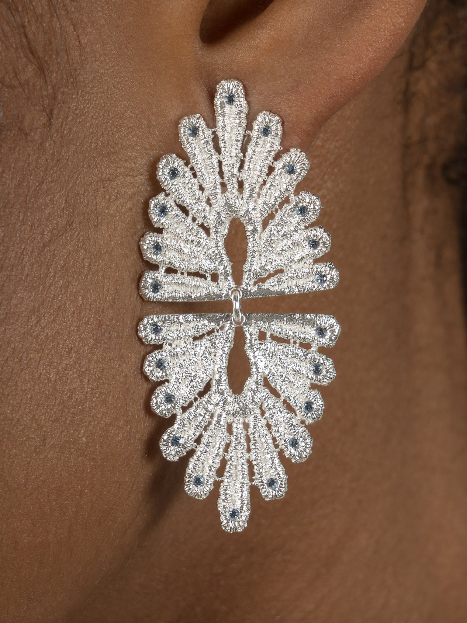Presenting The Guipure Topaz Earrings - a stunning tribute to my grandmother's legendary Alice lace finesse, these solid silver wonders emulate the intricate allure of lacework. Their vintage-inspired design exudes an undeniably chic essence that transforms into a cutting-edge statement once adorned.