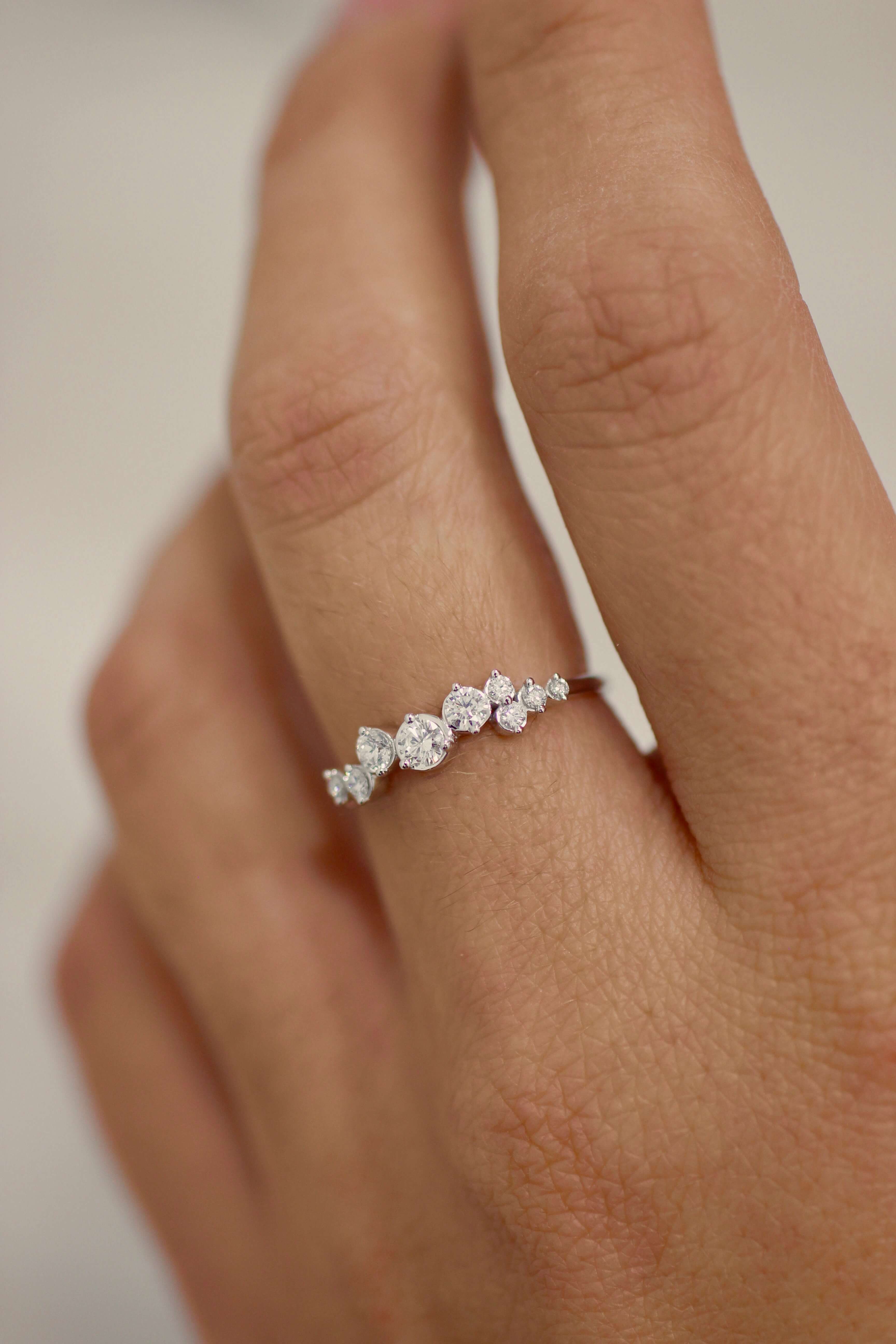 The Cloud Diamonds Ring is crafted in 18K white Gold, with extreme delicacy and subtlety, nesting 9 majestic G-H, VSI, EXCELLENT Cut, conflict-free, natural Diamonds.
