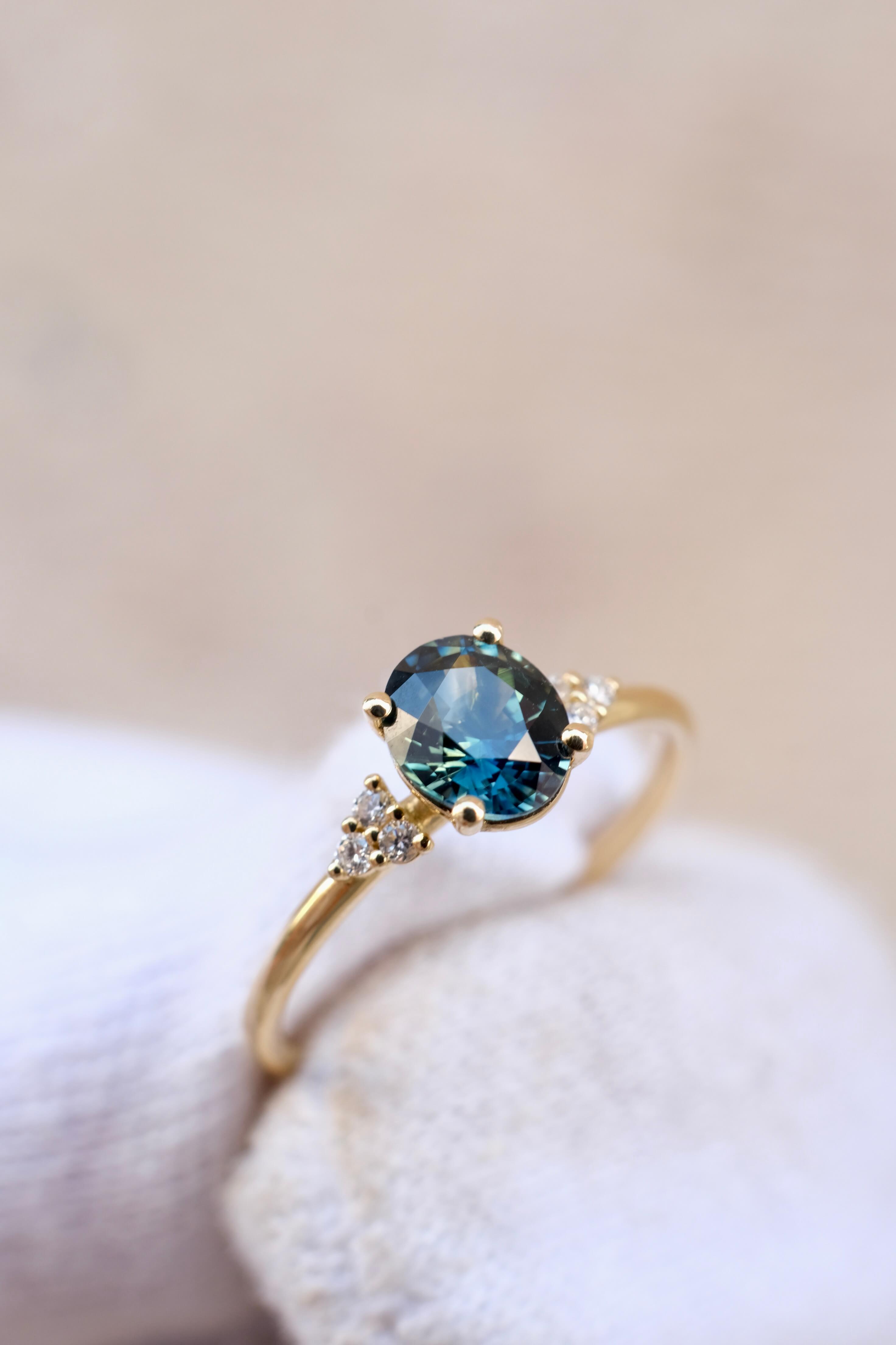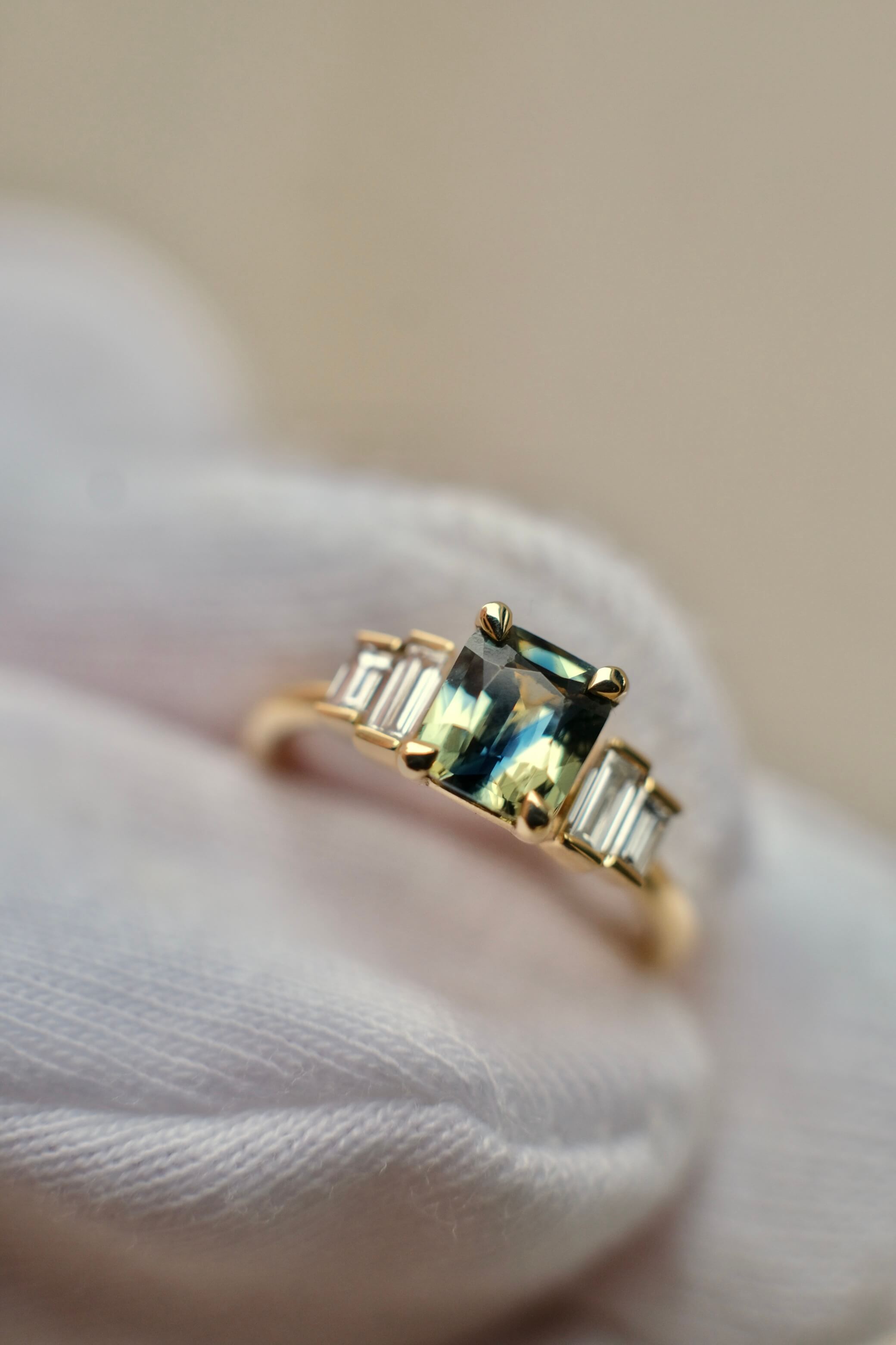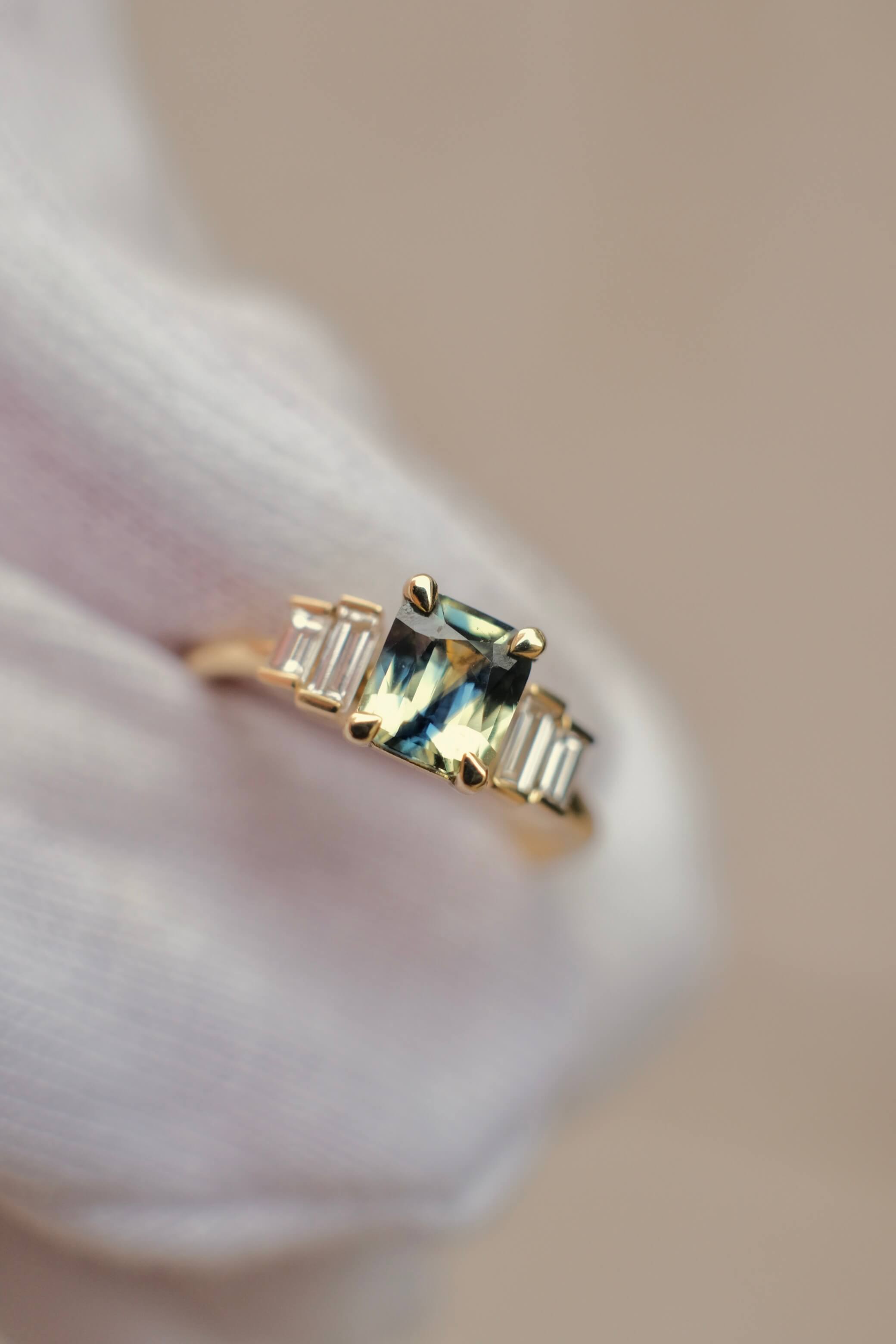 The Alice Ring is a modern five-stone design featuring an emerald cut Australian sapphire in shades of blue and green, accented by four baguette cut natural Diamonds.