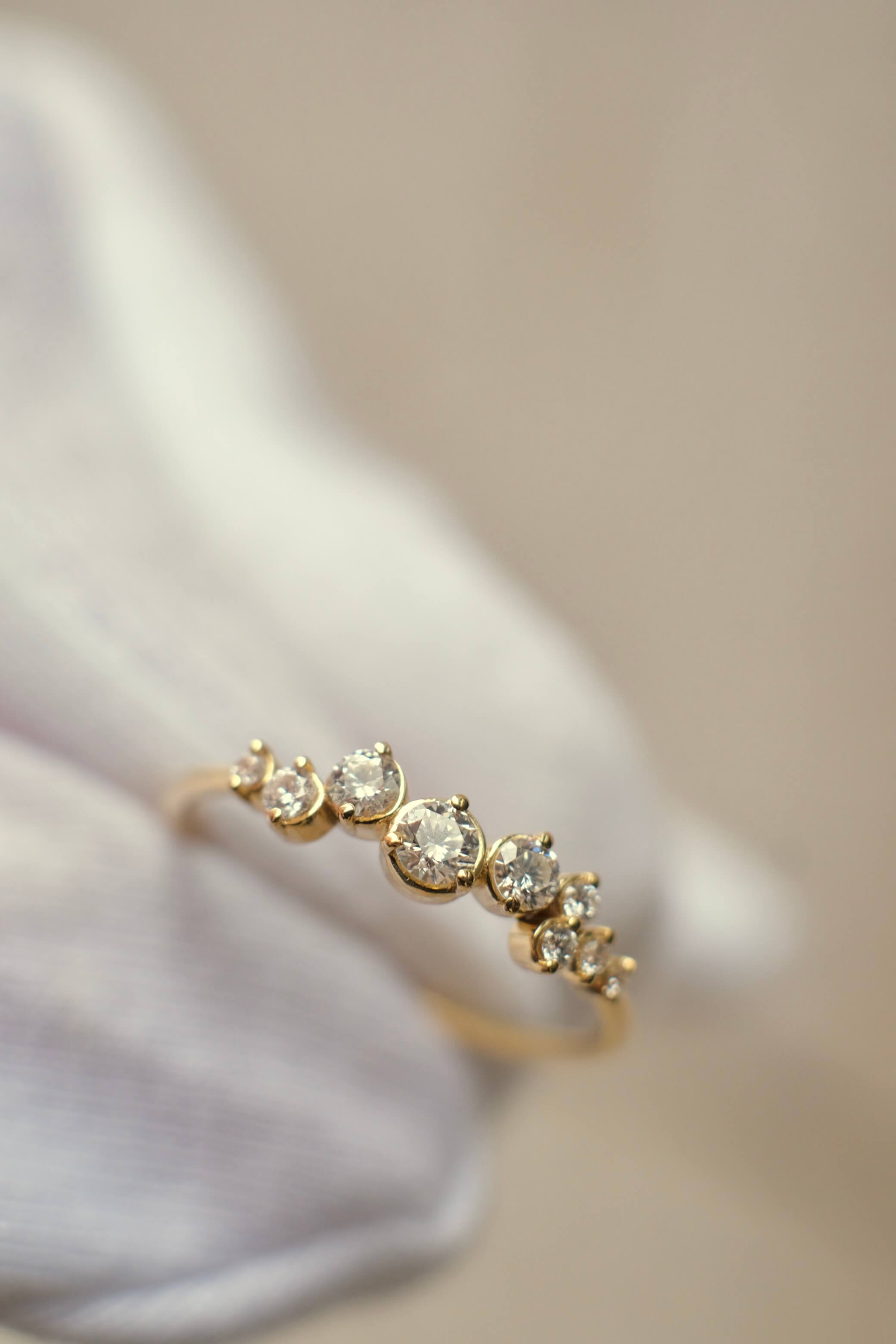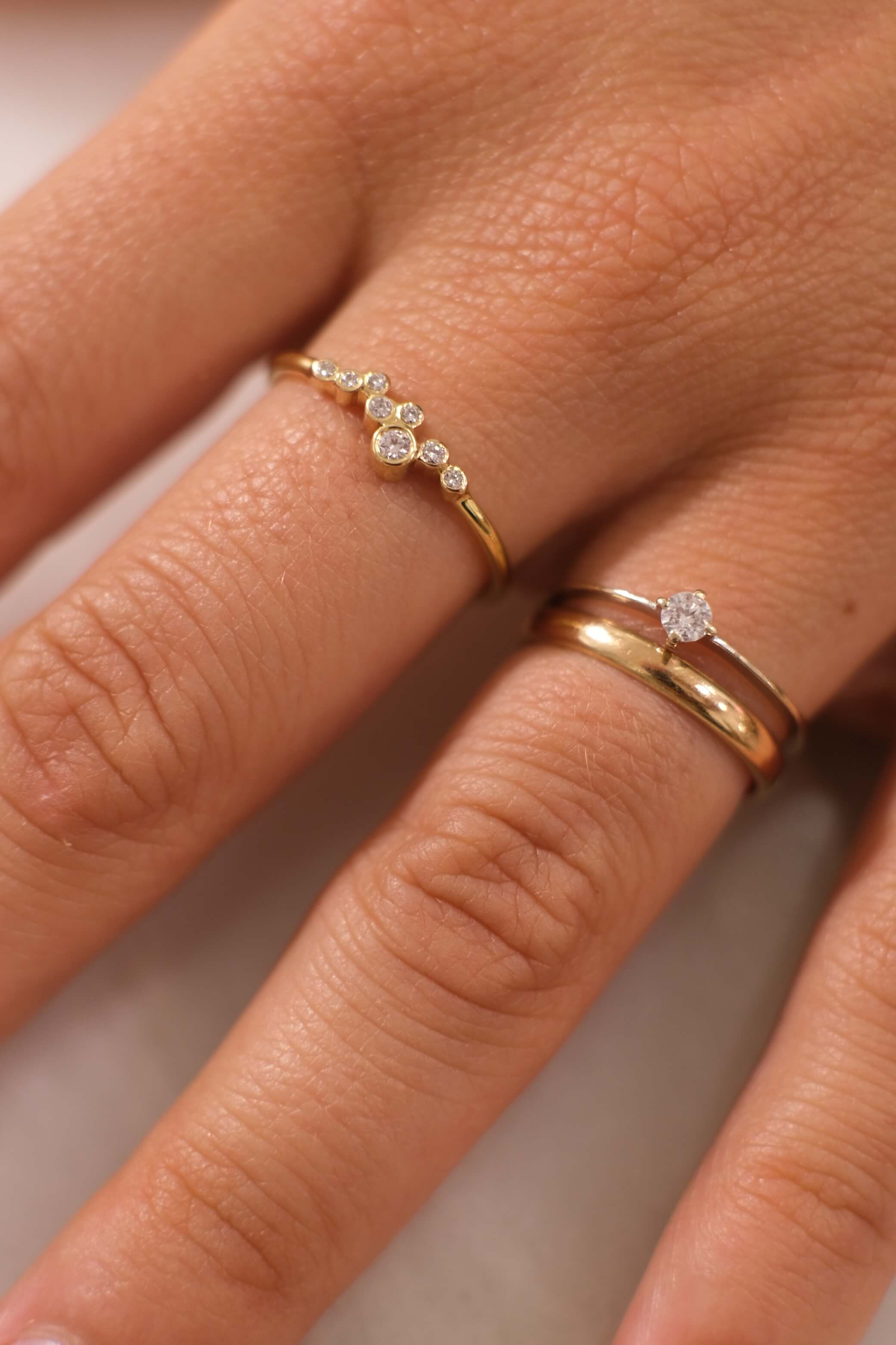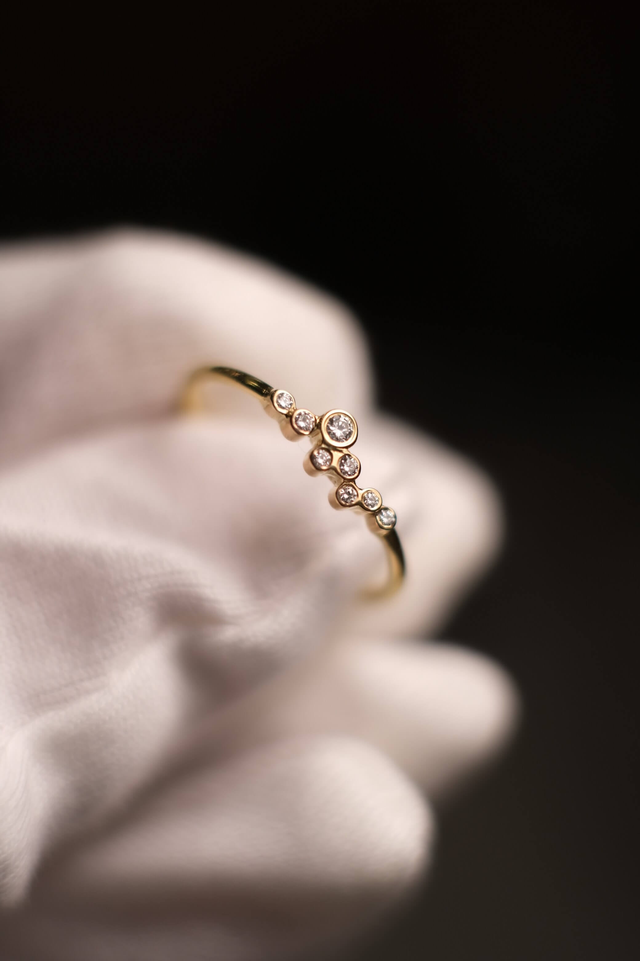 A delicate constellation of diamonds, each one bezel-set with care, resting gently on a slender band of 18k yellow gold. A cluster of light—organic, asymmetrical, and quietly brilliant. Created to be worn effortlessly, every day, as a second skin.