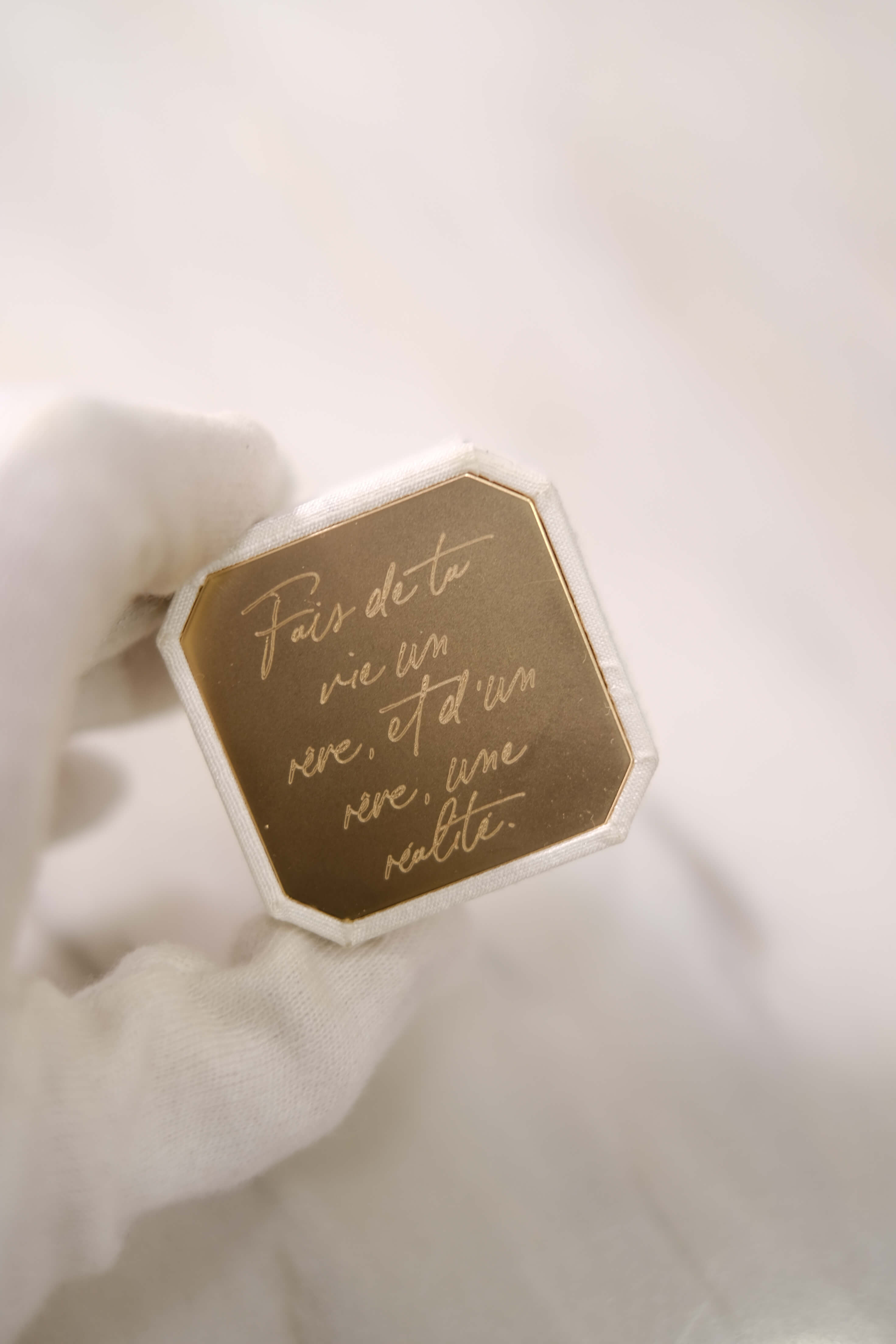 The Crosby Proposal with Matte Gold metal finish & personalized phrase.