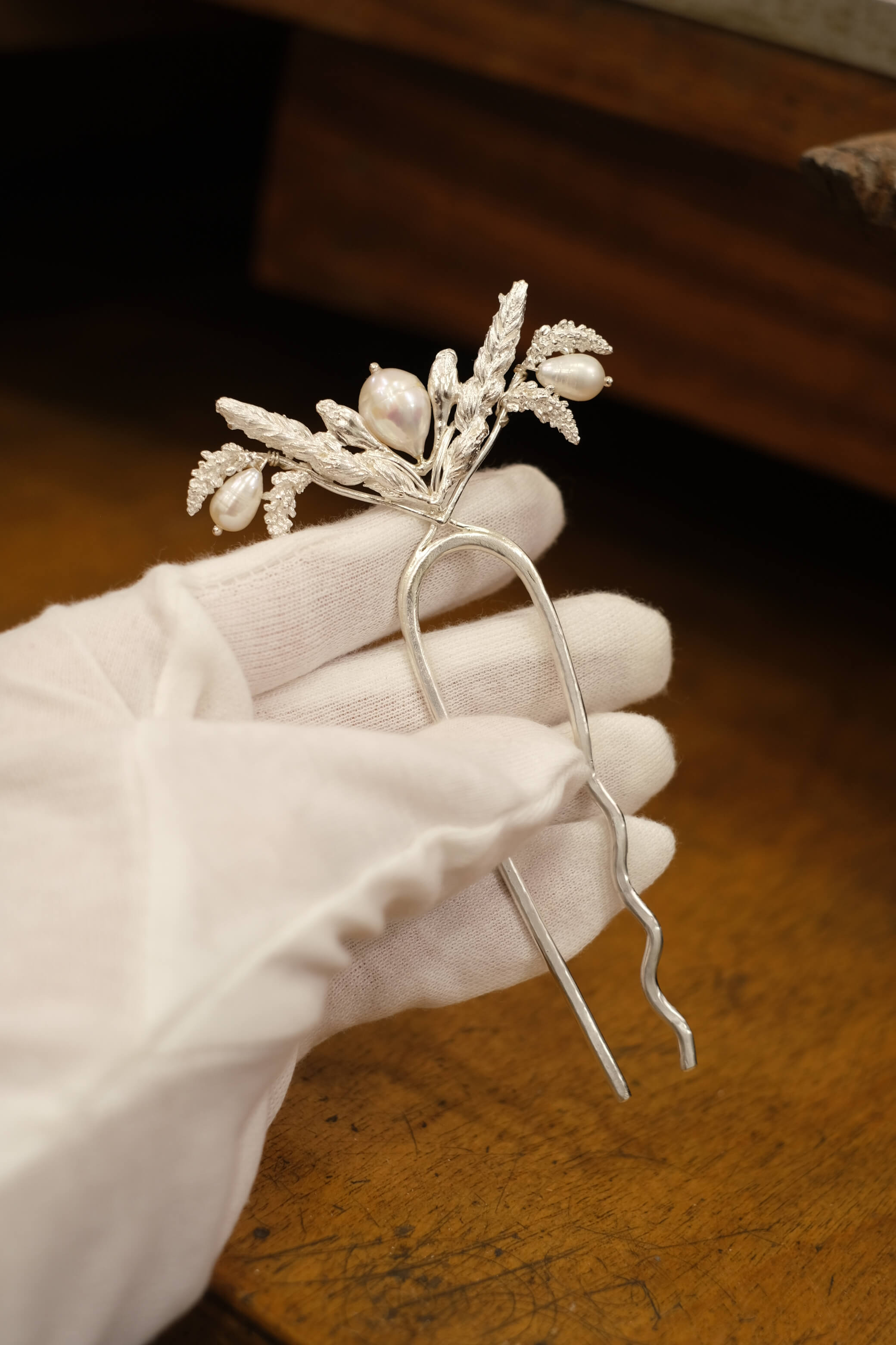 Solid Sterling Silver hair piece with pearls and nature motifs.