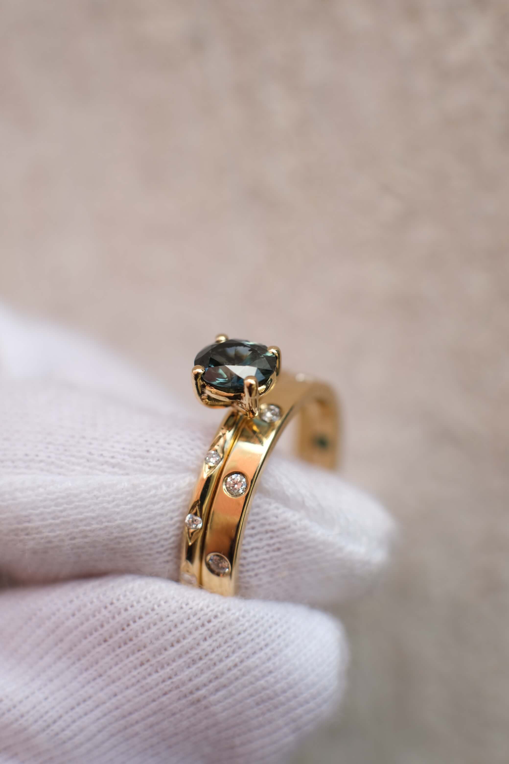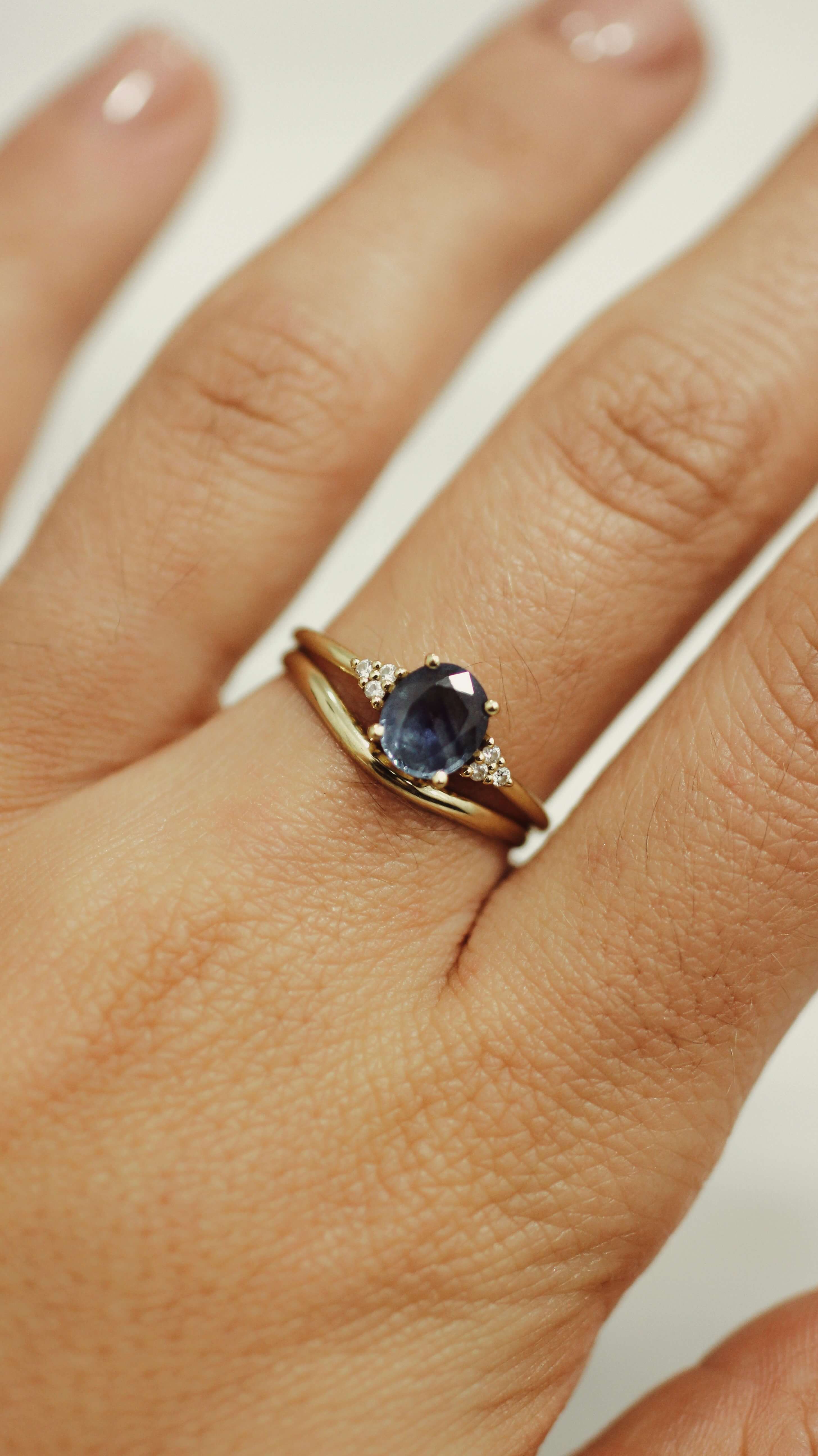 Matching Set - 18k yellow Gold Deep blue Sapphire Engagement ring & Wedding band